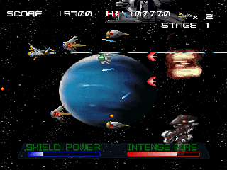 パワーアップアイテムは『メインショット』と『サブショット』の2系統があり、特定の敵キャラを倒すと出現するようになっています。また『インテンスファイア』と呼ばれる、ゲージが最大のときに使えるショットも用意されています。
